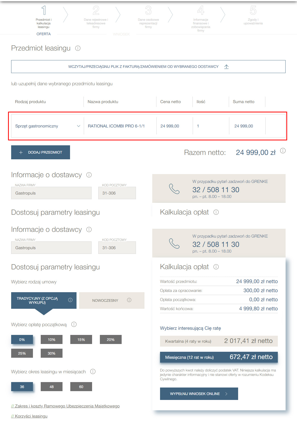 W sklepie internetowym Gastropuls.pl istnieje możliwość zakupu produktów na zasadach leasingu. Na karcie produktu pod przyciskiem dodaj do koszyka znajdują się 2 linki prowadzące do oferty leasingowej firm: Leaselink i Gernkee.