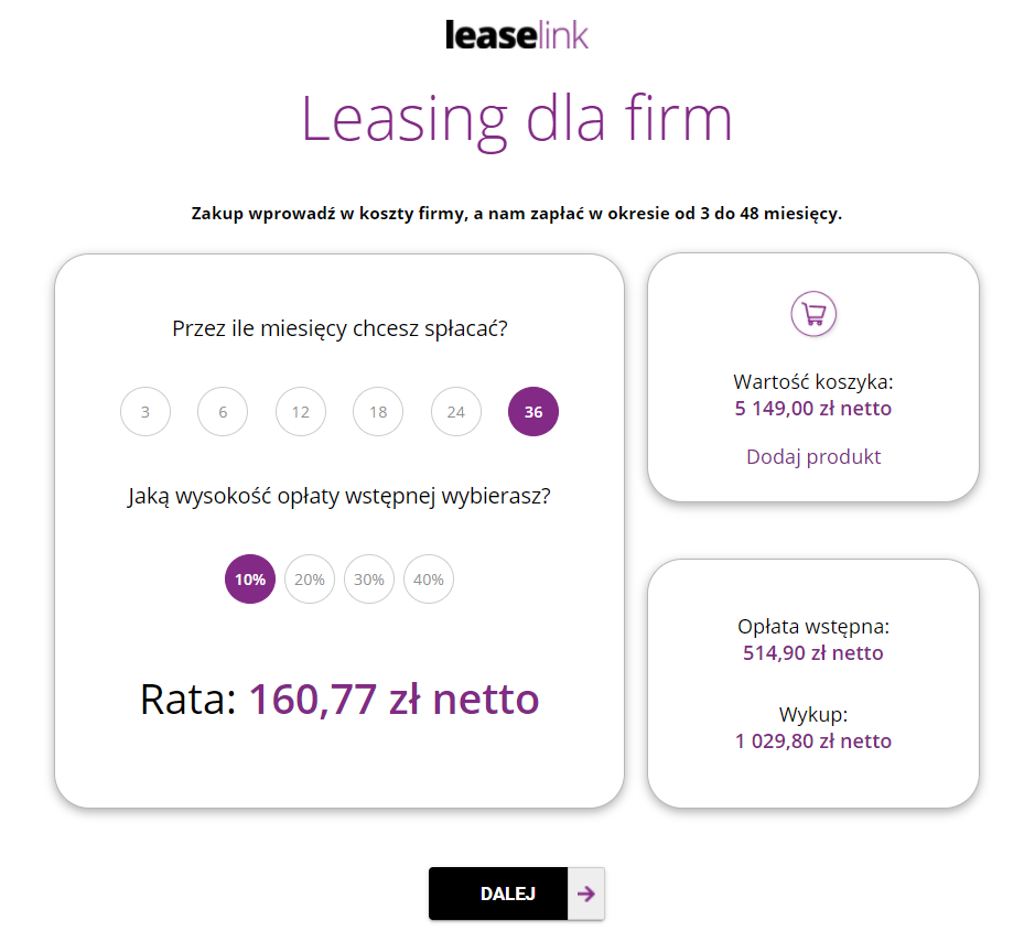 W celu zapoznania się z ofertą Leaselink kliknij w przycisk "weź leasing teraz". W nowo otwartym oknie pojawi się proponowana kalkulacja. Dopasuj propozycję do swoich potrzeb i postępuj zgodnie z instrukcjami.
